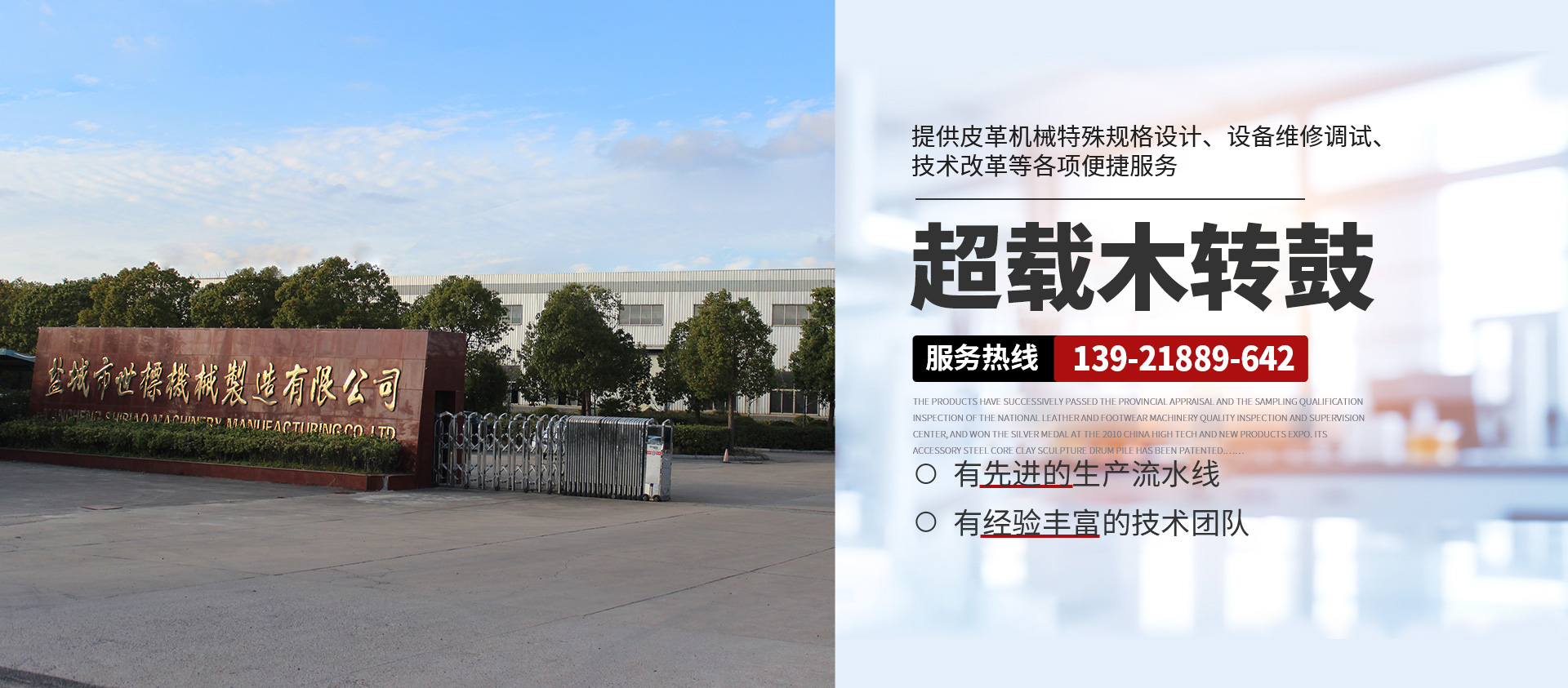 本公司常年提供超載木制轉(zhuǎn)鼓( 意大利/西班牙版本)、GJOB1-2型懸掛式木制轉(zhuǎn)鼓、鐵制轉(zhuǎn)鼓、Y型不銹鋼全自動分格鼓、全自動不銹鋼圓形、八角形摔軟轉(zhuǎn)鼓、PP染色等多功能轉(zhuǎn)鼓、HC系列劃槽、不銹鋼試驗轉(zhuǎn)鼓等皮革機械產(chǎn)品,產(chǎn)品暢銷浙江、山東、廣東、福建、河南、河北、四川、新疆、遼寧等地,且遠銷非洲、東南亞、南美洲、中美洲等多國,深受各大制革廠家的青睞。產(chǎn)品相繼通過省級鑒定和全國皮革、制鞋機械質(zhì)量檢測監(jiān)督中心的抽樣合格檢驗,在2010中國高新技術(shù)、新產(chǎn)品博覽會上一舉榮登銀獎寶座,其配件鋼芯泥塑鼓樁獲 專利權(quán)。本公司并向客戶提供皮革機械特殊規(guī)格設(shè)計、設(shè)備維修調(diào)試、技術(shù)改革等各項便捷服務(wù),具有健全的檢測體系和可靠的售后服務(wù)。